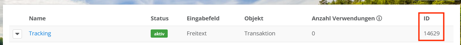 - In der Übersicht der benutzerdefinierten Felder sehen Sie rechts eine ID, als Beispiel 14629. Diese ist für eine spätere Parameter-Übergabe wichtig. Ausführliche Informationen zu den benutzerdefinierten Feldern finden Sie hier.