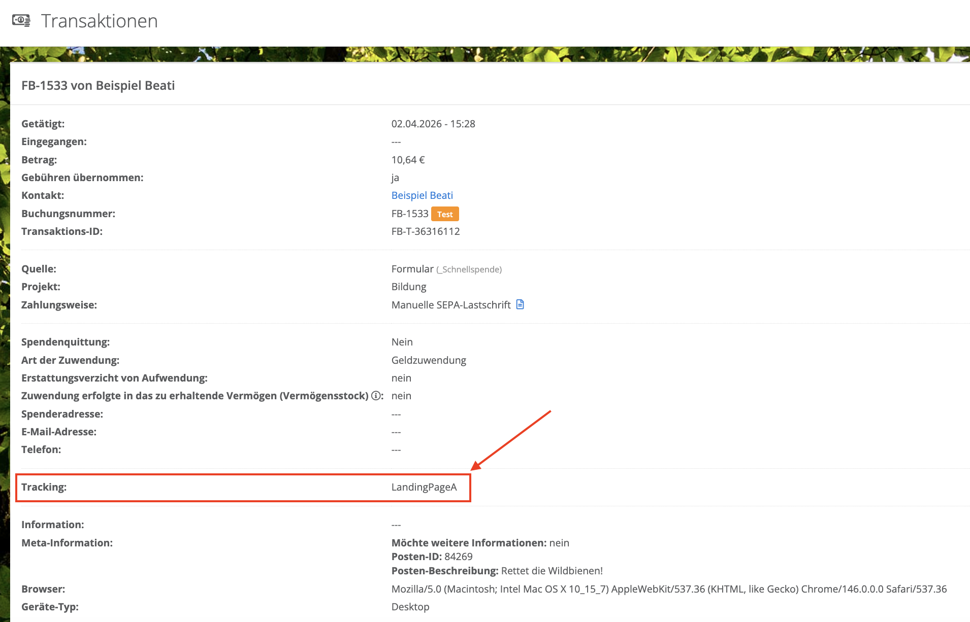 Testen Sie dies unbedingt mit einer Test-Transaktion, um zu prüfen, ob die Tracking Information im Formular visuell nicht sichtbar ist und trotzdem in den Transaktions-Details später zu sehen ist - in diesem Beispiel wurde nur ein Parameter und dort der Wert "LandingPageA" übergeben: