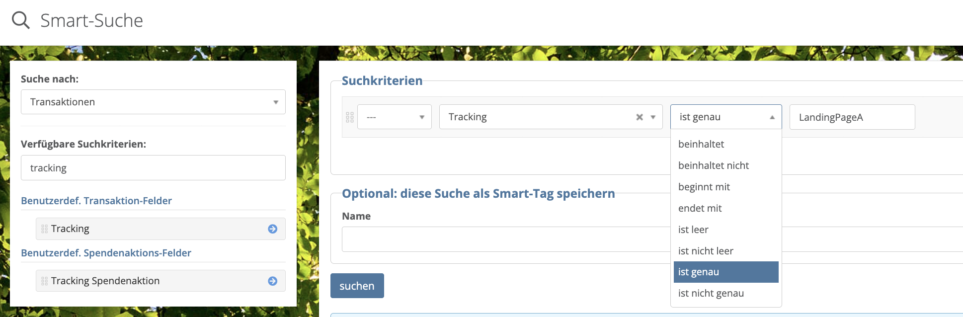Über die Smart-Suche können Sie nach dem benutzerdefinierten Transaktions-Feld und dessen Inhalt suchen, um eine Auswertung vorzunehmen (z.B. Suche nach Transaktionen und das Feld auswählen und z.B. auf "ist genau" und einen festen Wert suchen lassen). So finden Sie alle Transaktionen, die über dieses Tracking-Ziel getätigt wurden.