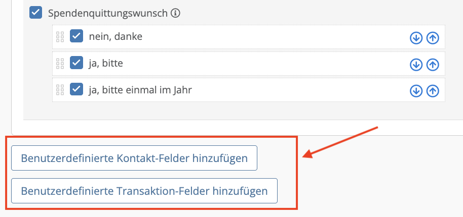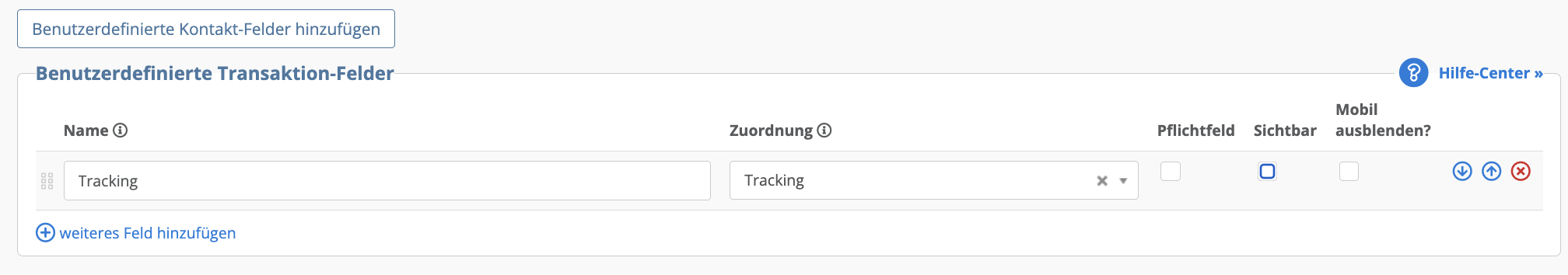- Klicken Sie auf den Button Benutzerdefinierte Kontakt-Felder hinzufügen bzw. Transaktion-Felder