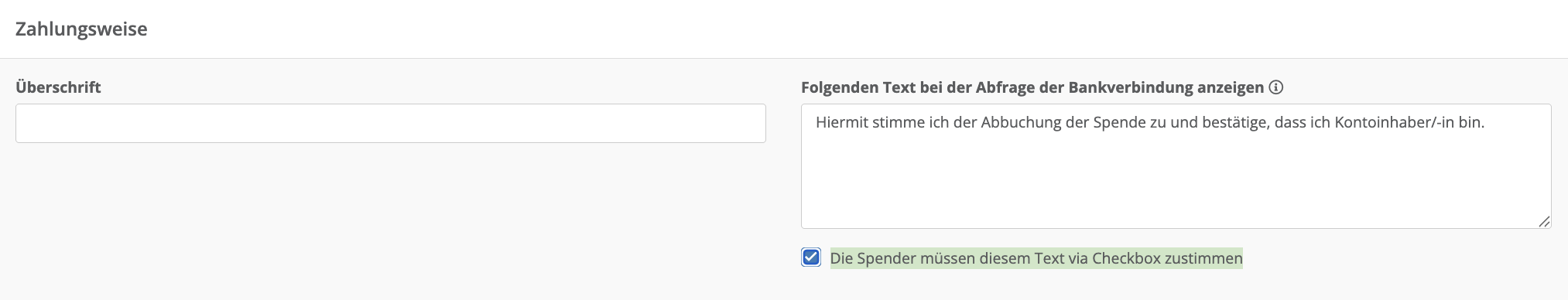 - Bei Online-Transaktionen sind die automatisch erstellten SEPA-Mandate sofort aktiv. Empfehlung: Nutzen Sie daher in den Wordings der Formular-Einstellungen die Möglichkeit, dem Einzug via Checkbox online zuzustimmen (als Pflichtfeld):