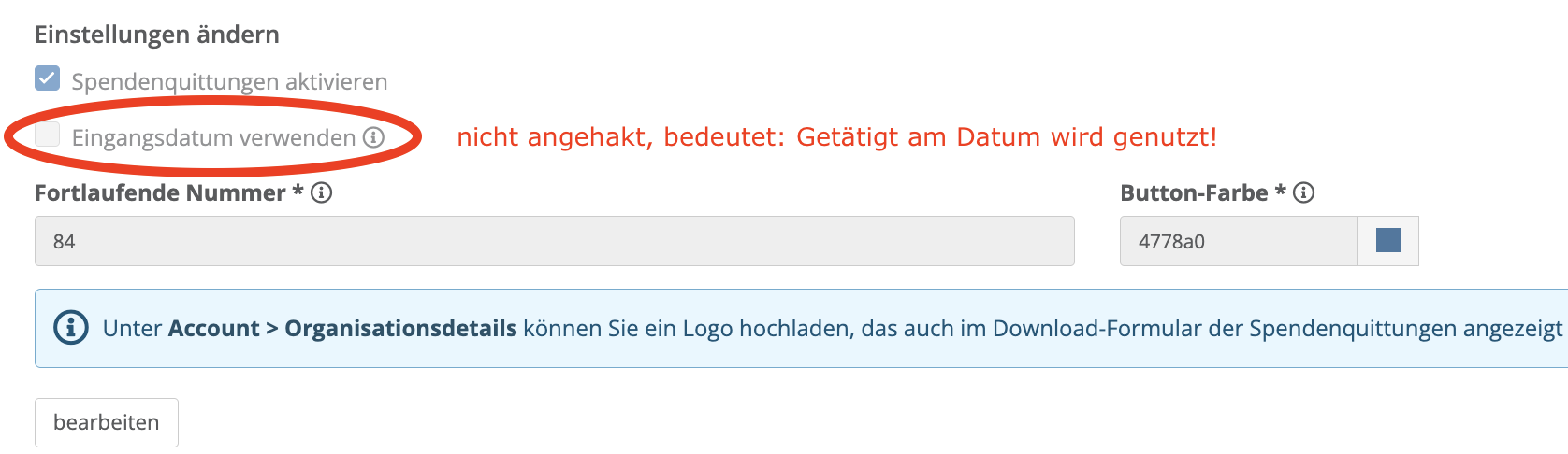 Wenn Sie statt dem "Getätigt am"-Datum, das "Eingegangen am"-Datum für Ihre Spendenquittungen nutzen möchten, können Sie die Option "Eingangsdatum verwenden" anhaken.