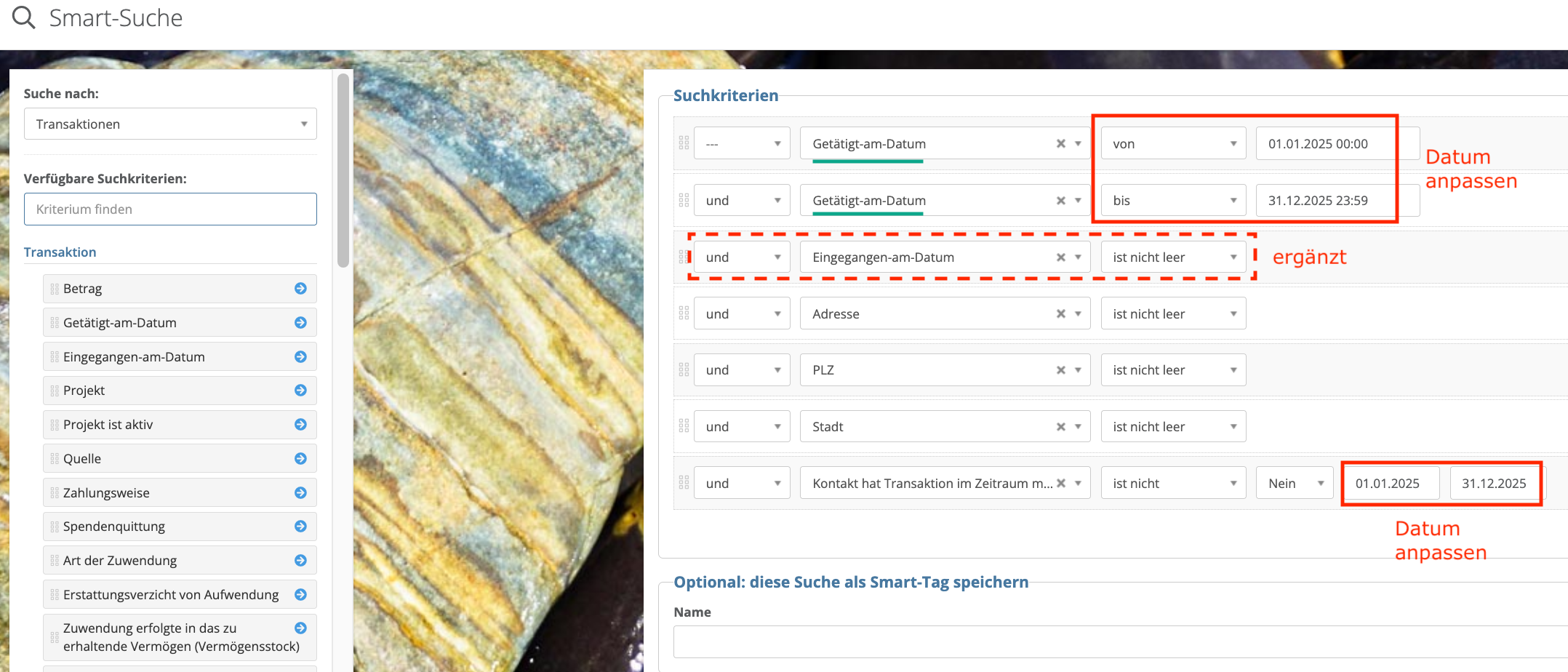 1. Das erste Beispiel zur Smart-Suche zeigt Ihnen alle eingegangenen Transaktionen im fraglichen Kalenderjahr, wenn die/der Spender*in im gleichen Kalenderjahr mindestens eine Transaktion getätigt hat, bei der die/der Spender*in eine vollständige Adresse angegeben hat und als Spendenquittungswunsch "nicht nein" gewählt wurde (ergo "ja" oder "am Jahresende" oder "niemals" - wobei "niemals" technisch nicht quittiert werden kann).