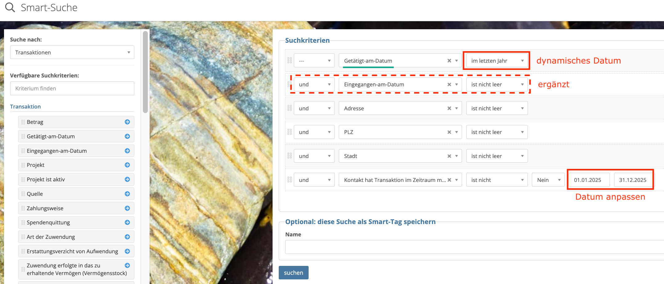 (Dann muss das Datum nur an einer Stelle geändert werden, praktisch für alle, die nur 1x pro Jahr rückwirkend eine Spendenquittung erstellen). - Das 2. Smart-Suche-Beispiel zeigt Ihnen alle eingegangenen Transaktionen im vorherigen Kalenderjahr, bei denen jeweils die/der Spender*in konkret pro Transaktion angegeben hat, dass für diese Transaktion eine Spendenquittung gewünscht wird. Wenn z.B. in dem vorherigen Kalenderjahr drei Transaktionen getätigt wurden, und bei einer davon keine Spendenquittung gewünscht wurde, dann wird Ihnen mit dieser Suche diese eine Transaktion auch nicht zur Quittungserstellung angezeigt.