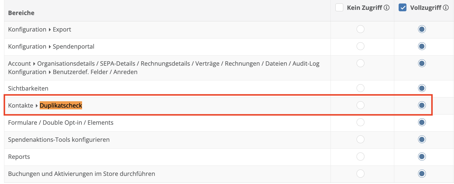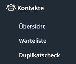 - Falls Sie diesen Menüpunkt nicht sehen, Ihr Account aber bereits im neuen CRM Vertragsmodell ist, liegt es an Ihren Nutzerrechten. Fragen Sie bei Ihrem Team (z.B. Accountinhaber*in) Zugriff auf die Funktion "Kontakte > Duplikatscheck" an: