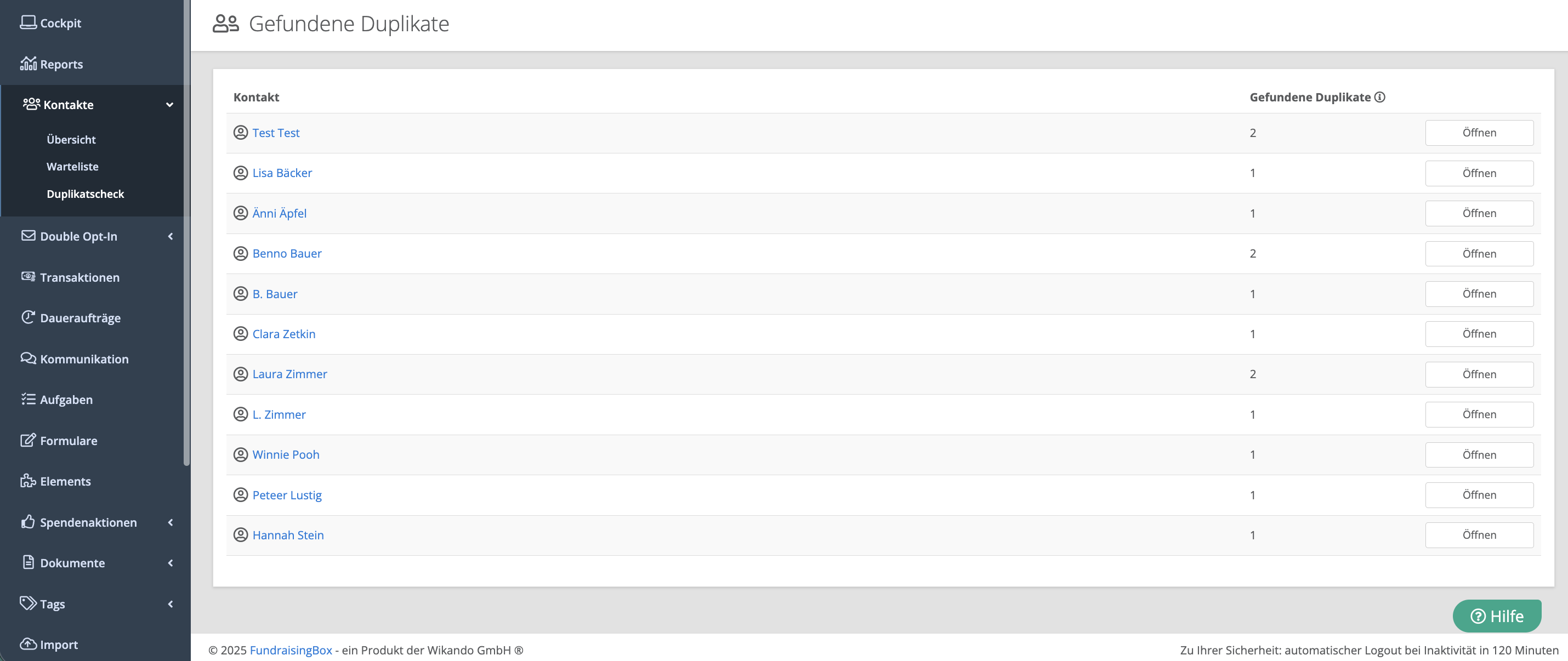 - Hier finden Sie alle Kontakte, die die FundraisingBox als potenzielle Duplikats-Kontakte gefunden hat: