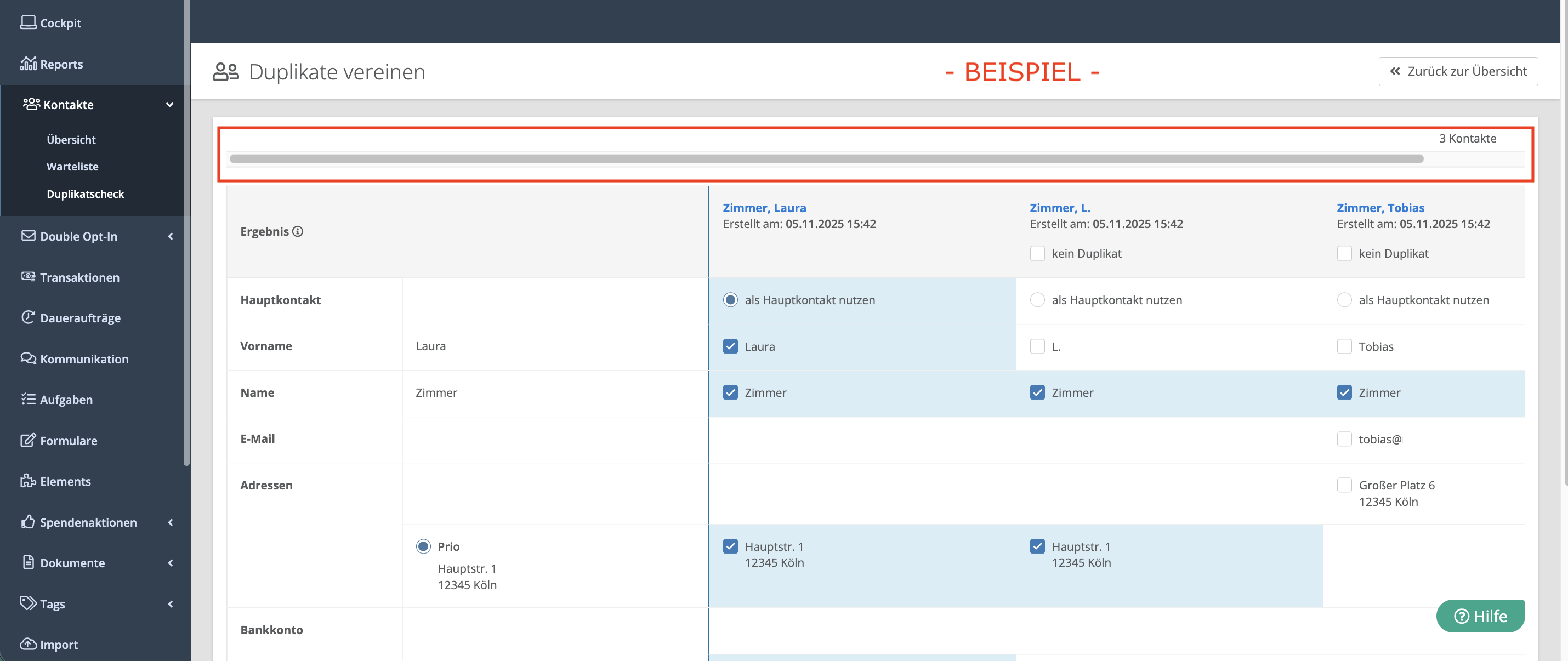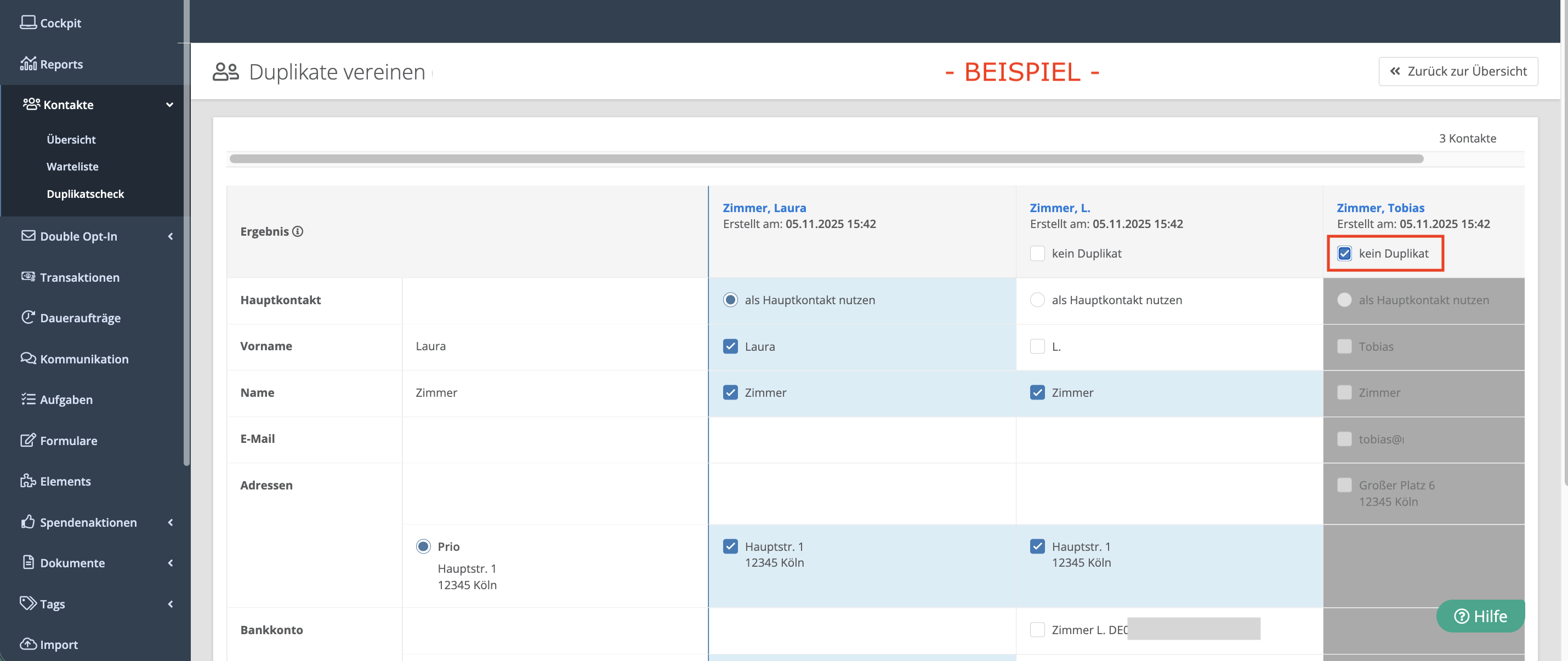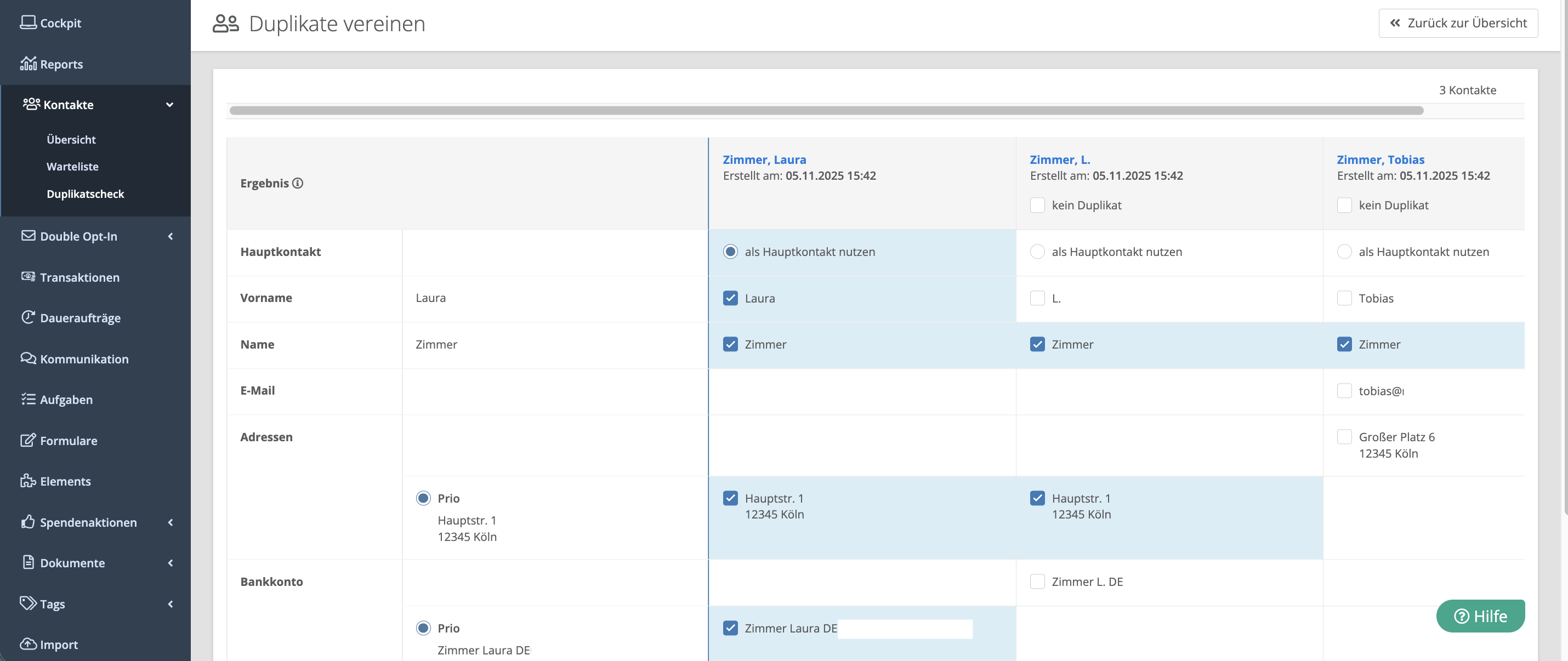 - Führen Sie den Vorgang mit weiteren Kontakten von Ihrer Duplikatscheck-Übersicht fort.