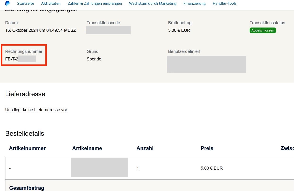 Die eindeutige Transaktions-ID der FundraisingBox (FB-T-ID) wird bei PayPal im Feld "Rechnungsnummer" dargestellt: