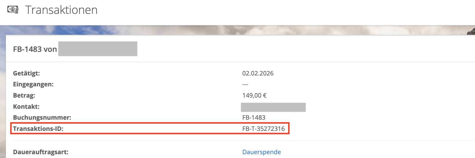 Klicken Sie auf eine beliebige Transaktion (z.B. den Betrag anklicken). Die FB-T-ID finden Sie im Feld "Transaktions-ID" in den Transaktions-Details:
