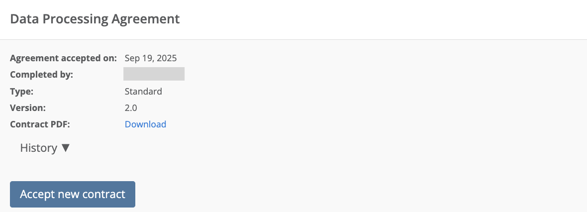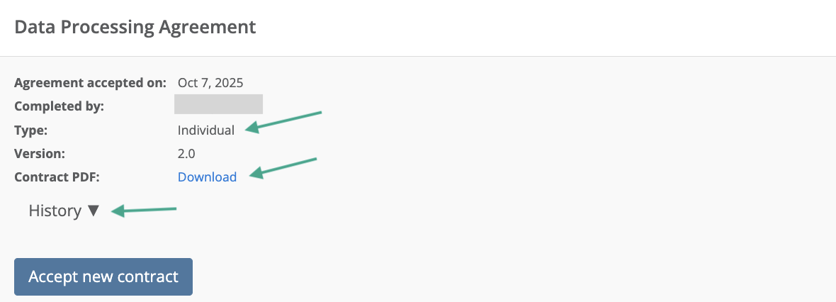 - Reload the page (e.g. F5 on Windows keyboard), you will then find your document and your history of previous DPAs – recognisable by the date under “Agreement accepted on”: